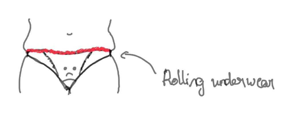 Incorrect Size: If your panties are too tight, they might roll because they’re stretched to their limit. On the other hand, if they’re too loose, there’s not enough tension to keep them in place, so they slide down.